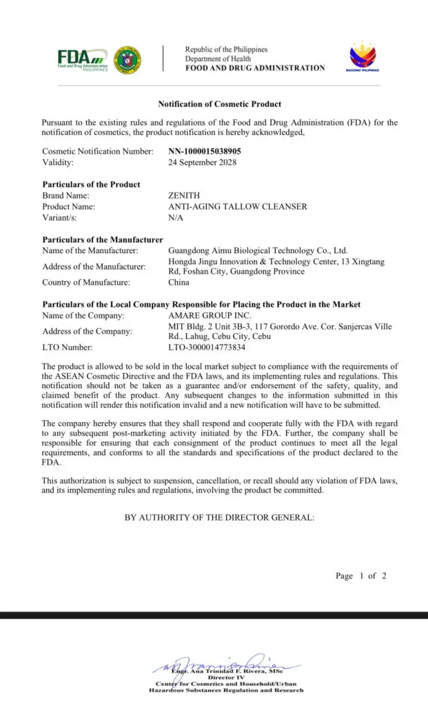 The FDA Notification Number of the Zenith Anti-Aging Tallow Cleanser is NN-1000015038905. Search it at the FDA’s Verification Portal or click here.